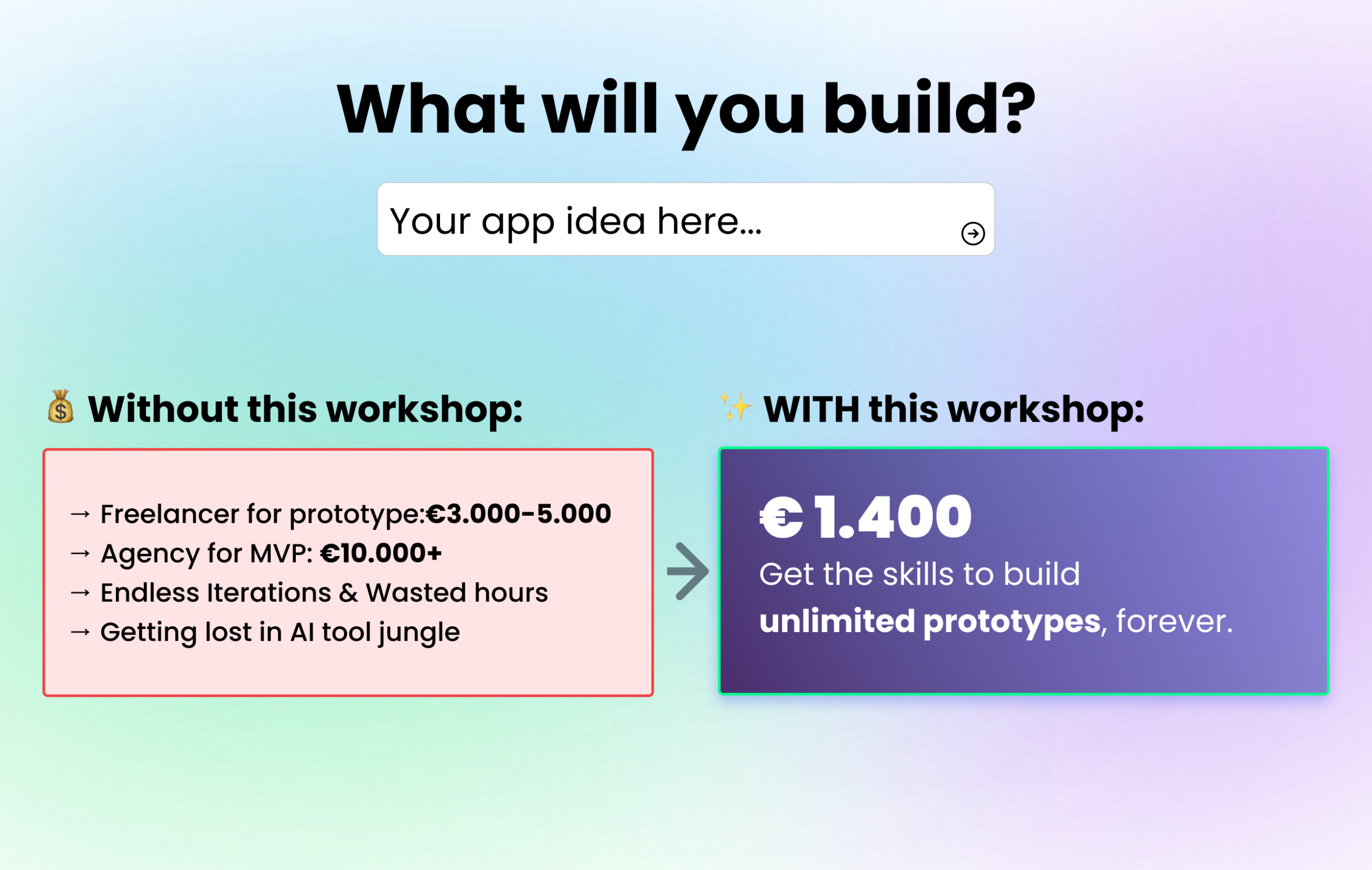 Die nächste Generation von Produktentwicklern schiebt Ideen nicht ins Backlog – sie validieren und prototypen eigenständig. Komm zu unserem eintägigen Intensiv-Workshop und verändere für immer, wie du mit Ideen umgehst.