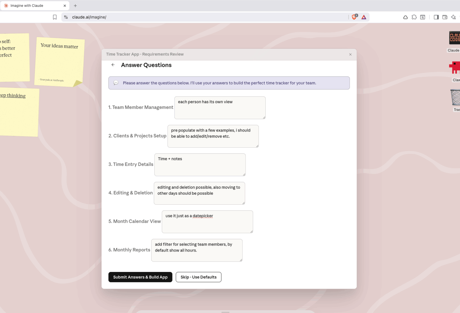 Before Claude started building, it asked clarifying questions: How should team member management work? What details should time entries capture? Should there be reporting features? I could either skip these and let Claude use defaults, or answer them to get a more tailored result. I answered them, hit submit, and watched the prototype appear.