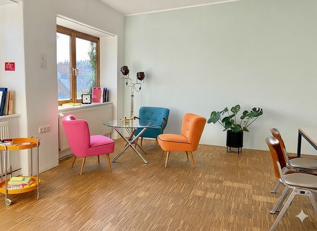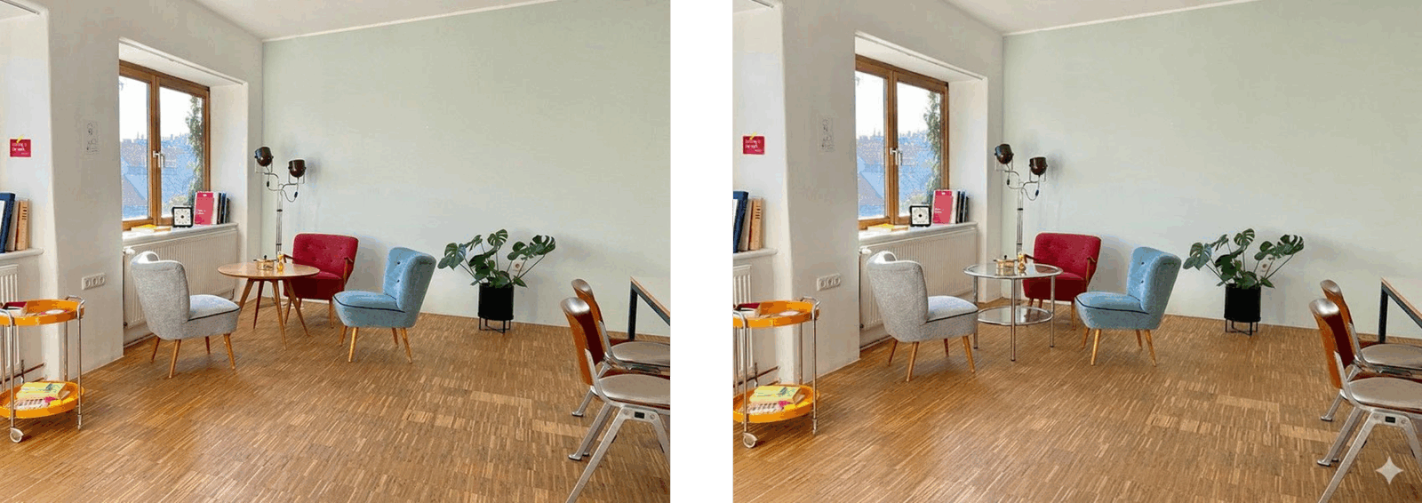 We began with a photo from our Fresh van Root shared space and prompted: “Replace the wooden table with a glass and chrome mid-century table.”