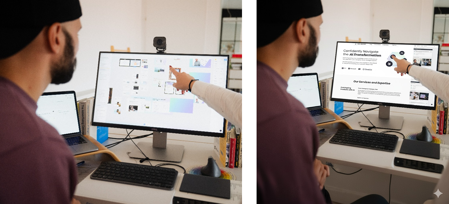Things became more complicated when we tried smaller, technical edits. We asked Gemini to replace the screenshot of a Figma file displayed on a computer screen with our AI Services page from the website. The first result cropped the screen incorrectly and added the page as a second image.