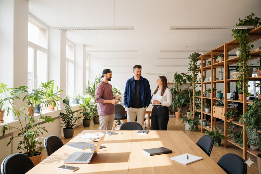 “Imagine this same team standing together in a new, modern workspace filled with plants, wooden textures, and daylight streaming through tall windows. Keep every person identical but make the scene feel alive as if they’re in the middle of a conversation. Maintain the same friendly, natural energy of the original photo, with consistent lighting and soft shadows across the floor.”