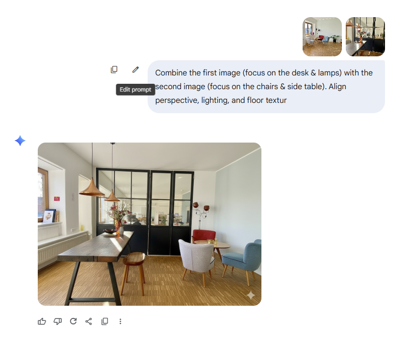 We wanted to know how well it performs when merging multiple photos. We used two pictures from the same space, one showing the meeting table and another showing the lounge area, and asked it to create a connected open workspace.