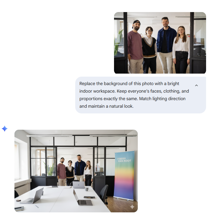 So we tested it in our own process using Fresh van Root office photos, team portraits, and creative prompts we’d typically create for blog visuals. Here’s what we found.
