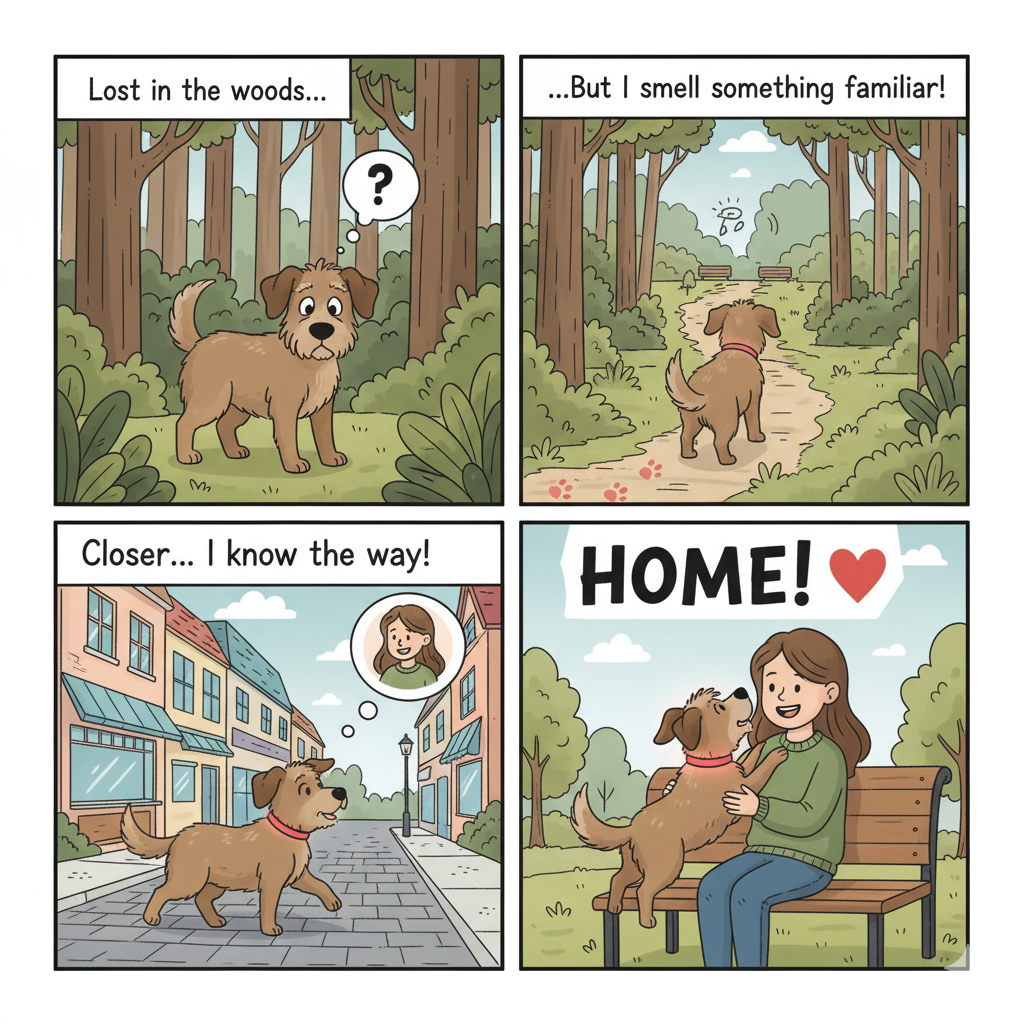 “Create a short comic strip of a dog finding its way back to his owner.”