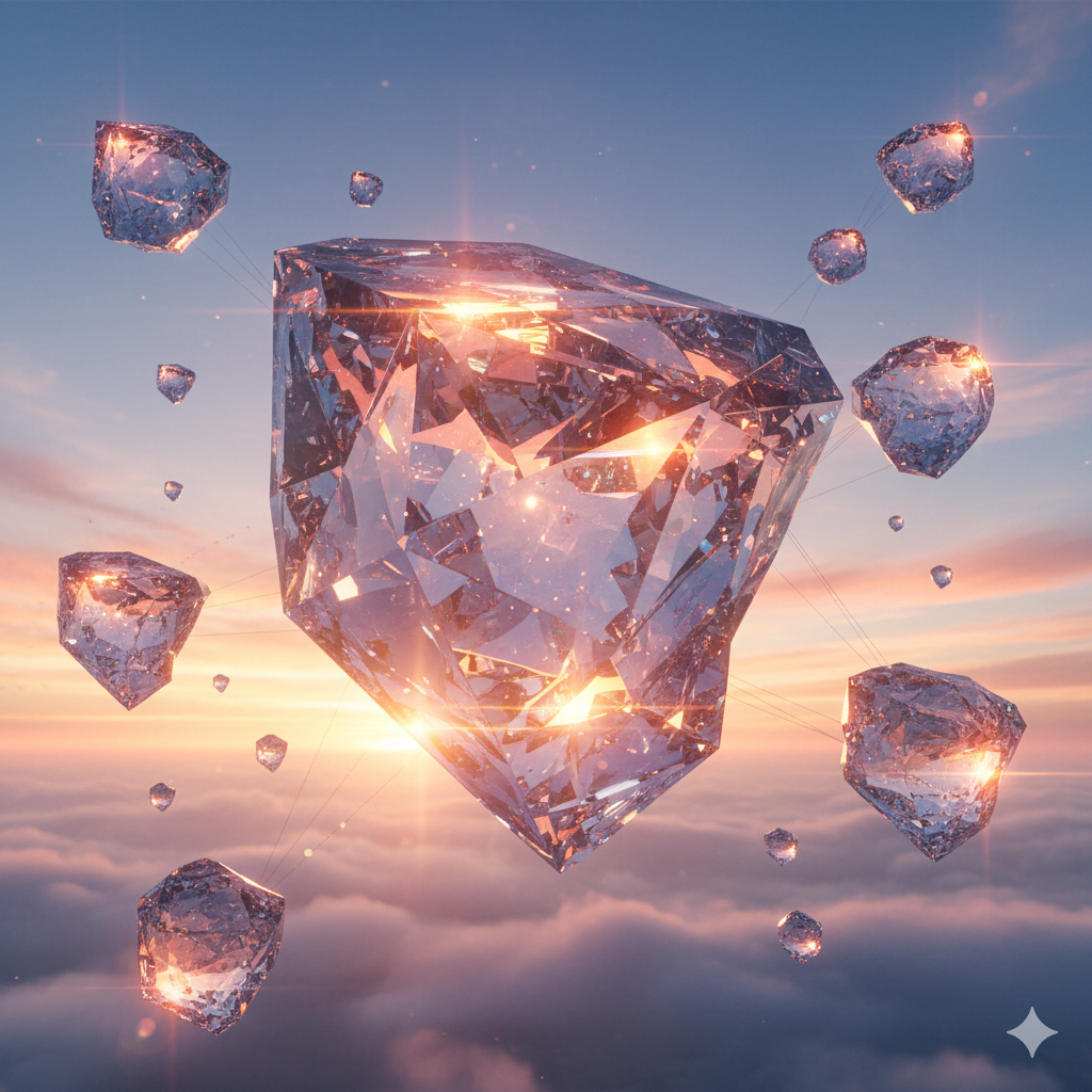 “Create a dream-like landscape of floating islands made of glass, each reflecting the sunset differently. High resolution, photoreal, 16:9.”