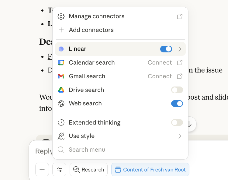 We use Linear to manage our work at Fresh Van Root. Linear supports MCP, which means I can connect Claude directly to our project management system. Here’s how this plays out in practice.