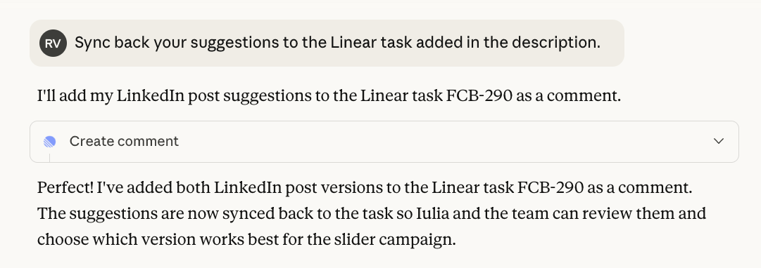 Claude updated the Linear task directly with the structured content strategy. No copy&paste. No context switching. Everything stayed connected.