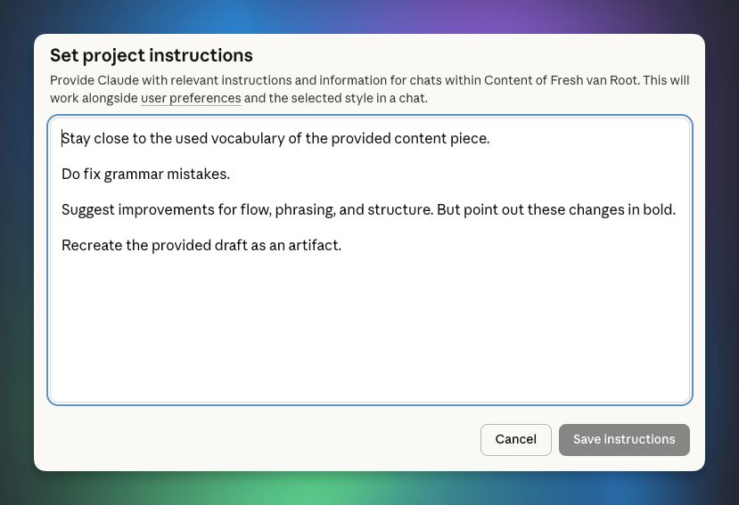 These are the simple, no-nonsense instructions I’ve set up in a Claude project – you can re-use them if you have the same goal: