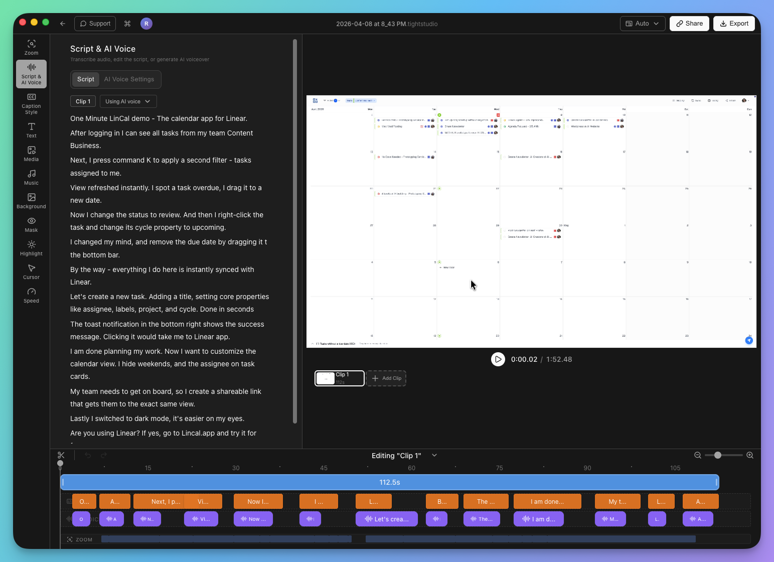 Tight Studio is a new contender in the screen recording and video editing space, built for Mac. You can record your screen, camera, and audio, then polish the result with captions, zoom effects, and AI voiceover.